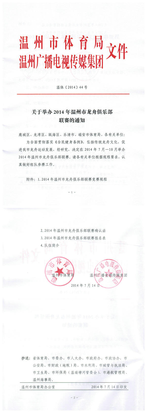 关于举办2014年温州市龙舟俱乐部联赛的通知