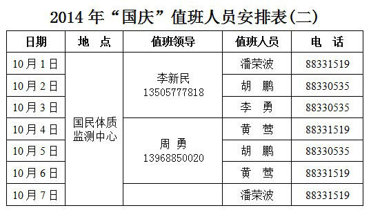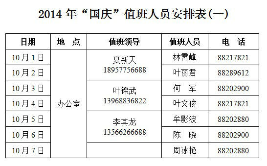 1、10月1日—10月7日值班时间:上午8:30—12:00、下午14:00—17:30;