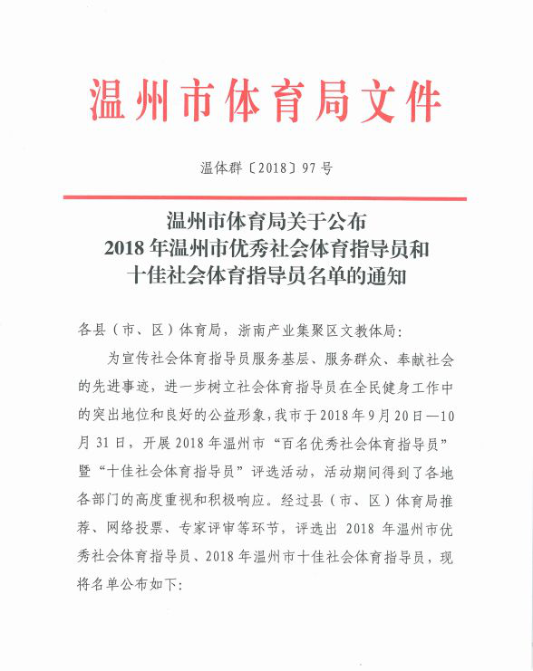 为深入贯彻落实《全民健身条例》,更好地宣传社会体育指导员服务基层、服务群众、奉献社会的先进事迹,进一步树立社会体育指导员在全民健身工作中的突出地位和良好的公益形象,提升社会体育指导员的社会影响力,激励社会体育指导员更好地为全民健身事业继续做好服务工作,市体育局在全市范围内开展2018年温州市“百名优秀社会体育指导员”暨“十佳社会体育指导员”评选活动。