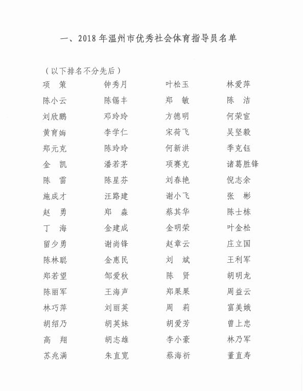 经过县(市、区)推荐、网络评选、专家组评审等环节,最终选出2018年度优秀社会体育指导员和十佳社会体育指导员,现将名单公布如下: