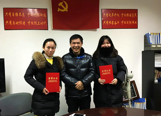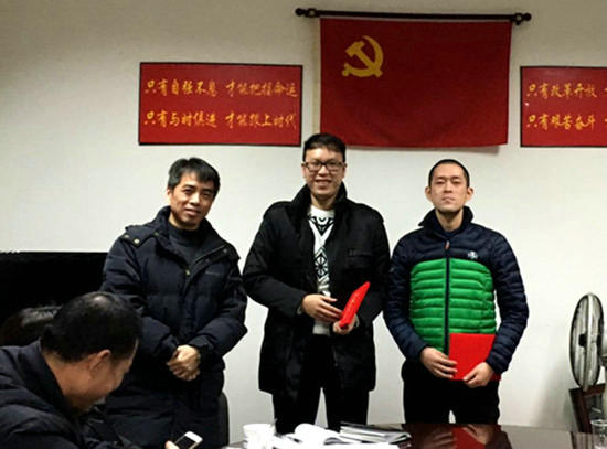 中心副主任叶锦武为获得工会积极分子的职工颁发荣誉证书