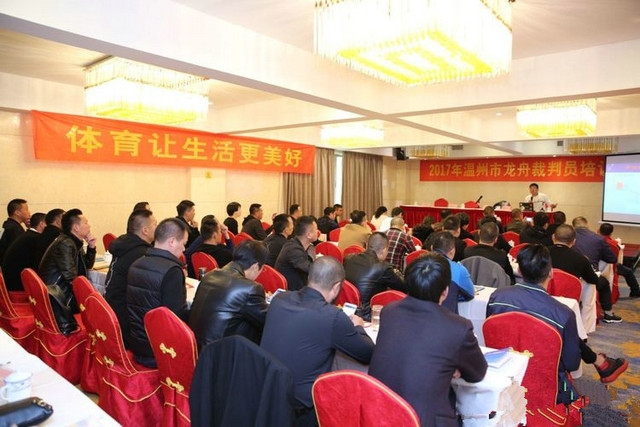 11月21日上午,2017年温州市龙舟裁判员培训班开班仪式在市区东瓯大酒店四楼悦俪厅举行。