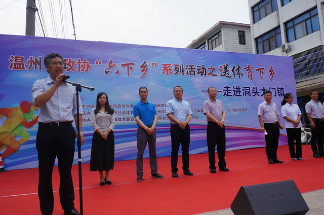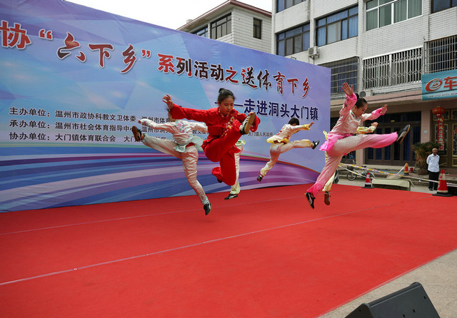 此次送体育下乡,市政协与市体育局向大门镇送出了各类体育器材,带去了精彩纷呈的体育表演、送去了体育教学课程、免费体制检测和科学讲座。开幕式上,太极拳、花样跳绳、轮滑表演等节目给大门镇的人民带去了一场场视觉盛宴。其中,由武术高级教练邓晓峰带领的温州市武术队带来的集体太极拳节目由全国冠军郑瑾蓉和多名省冠军参与表演,该节目曾获得浙江省女子节太极拳比赛地市组一等奖,由全国太极拳冠军、温州市武术队教练许乙静编排、指导。花样跳绳是温州市黄龙第二小的特色体育课程,舞动绳子的学生们就像那空中跳跃的小精灵,他们花样百出、层出不穷的花样跳,让人眼花缭乱,让全场的观众唏嘘不已。温州市轮滑运动协会带来的轮滑表演也技高一筹,运动员们在群众面前飞驰而过,高手们恣意炫技,摆着高难度动作,将轮滑运动集青春、时尚、阳光、竞技、健身于一体的特点表现地淋漓尽致。