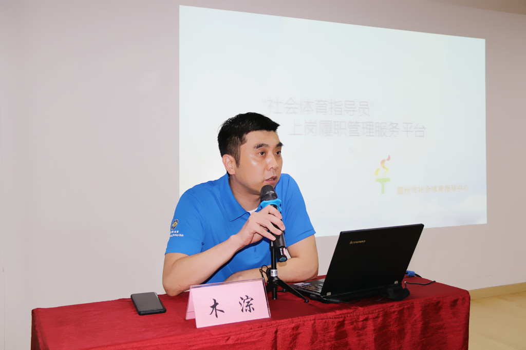 市社体中心副主任木淙介绍我市如何开展科学一站式服务理念和如何使用社会体育指导员平台。