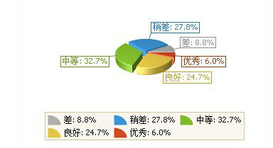 根据选择反应时总体评价分布图显示,优秀人数占总体的百分比为32.7%。良好人数占总体的百分比为42.3%。中等人数占总体的百分比为19.7%。稍差人数占总体的百分比为4.2%。差人数占总体的百分比为1.1%,说明这部分人群的反应和协调性差,在遇到突发事件和紧急情况时,不容易立即做出正确的反应(见下图)