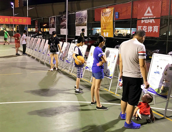 图1-6 夜幕下,市民观看科学健身科普展板