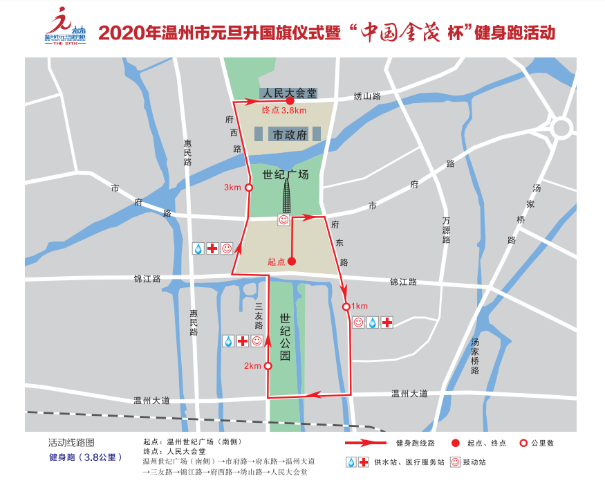 2020年元旦健身跑路线:起点从温州市世纪南广场出发,经市府路、府东路、温州大道、三友路、锦江路、府西路,终点到达绣山路人民大会堂,全程约3.8公里。