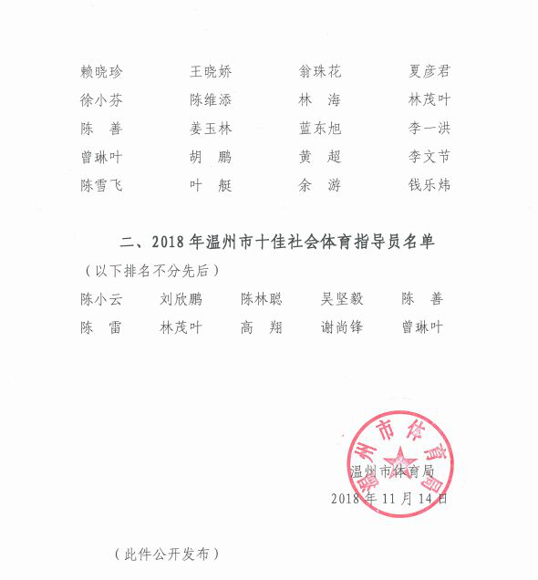 经过县(市、区)推荐、网络评选、专家组评审等环节,最终选出2018年度优秀社会体育指导员和十佳社会体育指导员,现将名单公布如下: