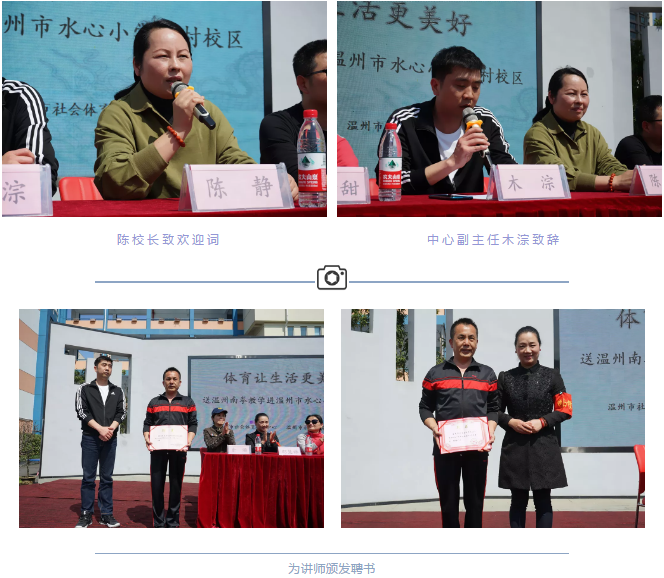 活动开课前举行了简短的开班仪式,温州市社会体育指导中心副主任木淙、社体科副科长李勇、温州市社会体育指导员协会秘书长余游、何甜甜、温州市水心小学校长陈静、副校长邵慧婵、陶鸥等出席了开班仪式。