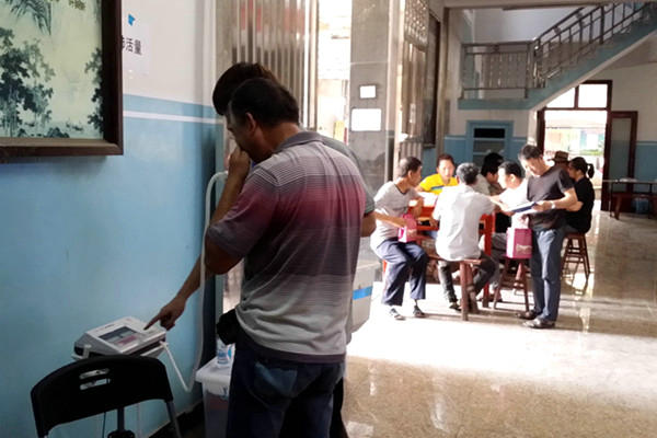图1 瓯海区横塘村测试现场,村民正在进行肺活量测试