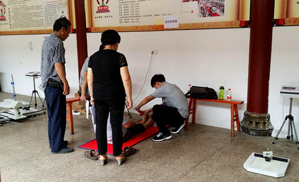 图3 龙湾区瑶溪街道测试现场,村民正在进行坐位体前屈测试