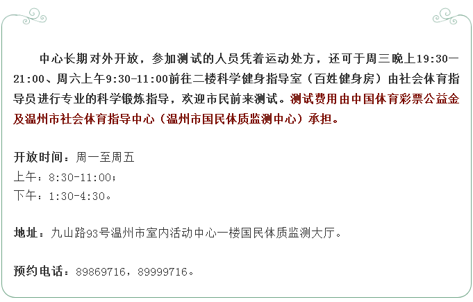 为贯彻落实《全民健身计划纲要》,充分利用现有公共资源,让广大市民更进一步地了解科学健身锻炼知识,温州市社会体育指导中心(温州市国民体质监测中心)与温州市公园管理处合作,在全市六大公园橱窗进行科普宣传。